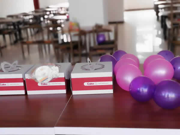 前来送祝福的同事们,在新建的员工餐厅里为过同事庆祝生日